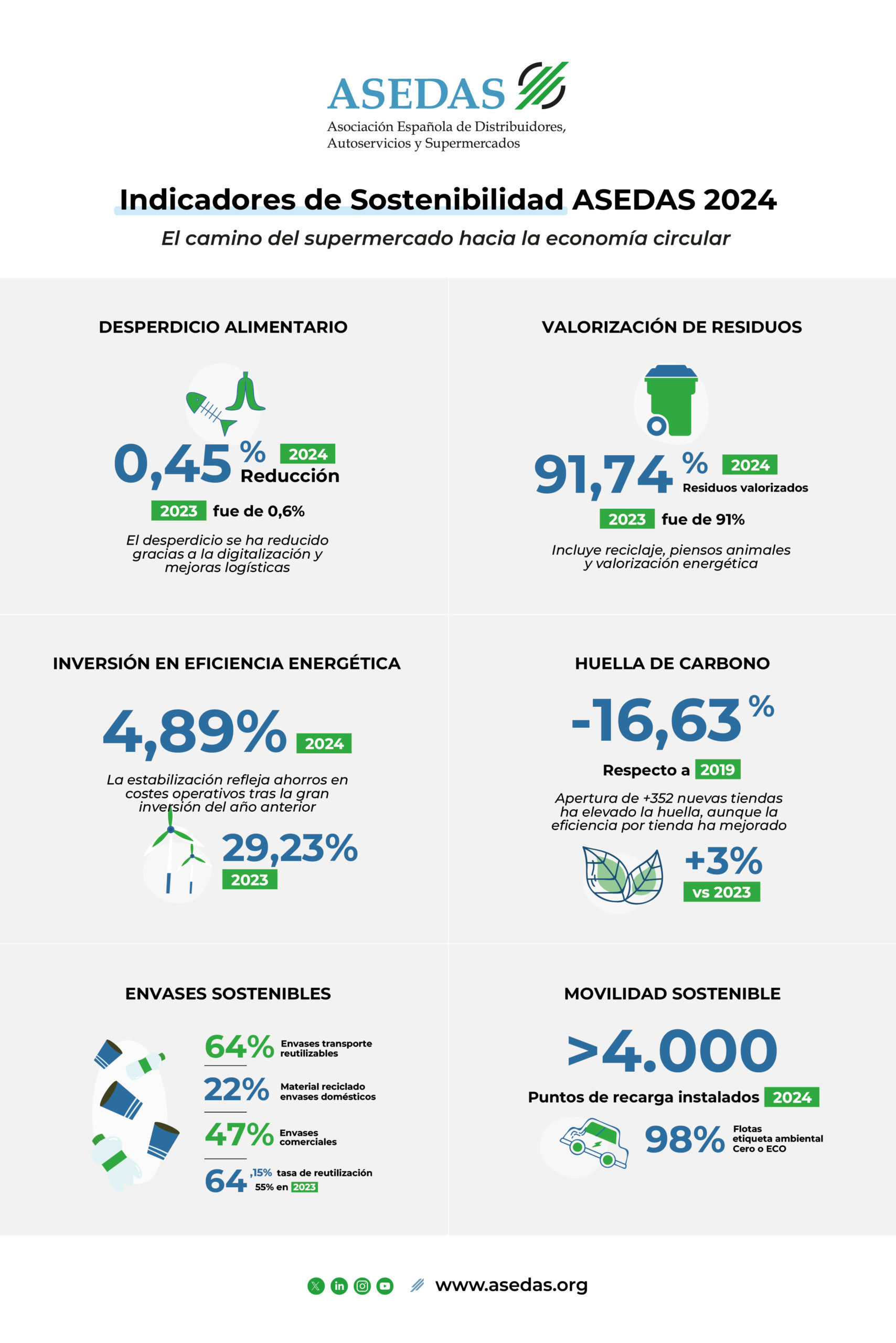 Supermercados comprometidos con la sostenibilidad y la economía circular: eficiencia energética, reducción y valoración de residuos, reducción de huella de carbono.